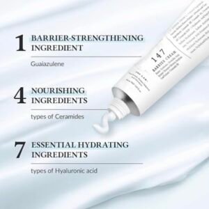 147 Barrier Cream enhances the skin barrier, nourishing the skin, and providing deep hydration. The cream achieves this through its patented ingredient, Paeonia Albiflora Flower Extract, which enhances the skin barrier. Additionally, it contains nourishing elements such as avocado fruit extract, Argania spinosa kernel oil, and Camellia sinensis seed oil. The cream also includes significant concentrations (10,000ppm each) of Artemisia Princeps Leaf Extract, Persea Gratissima (Avocado) Fruit Extract, and Brassica Oleracea Acephala Leaf Extract, offering a comprehensive approach to skincare needs.